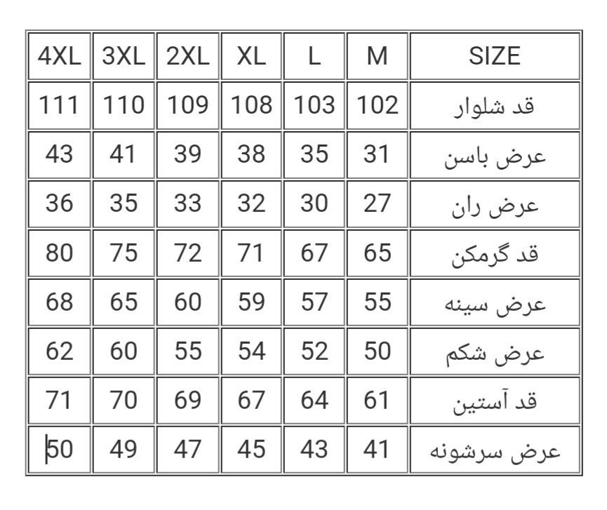 | عرض سرشونه | 41 | 43 | 45 | 47 | 49 |